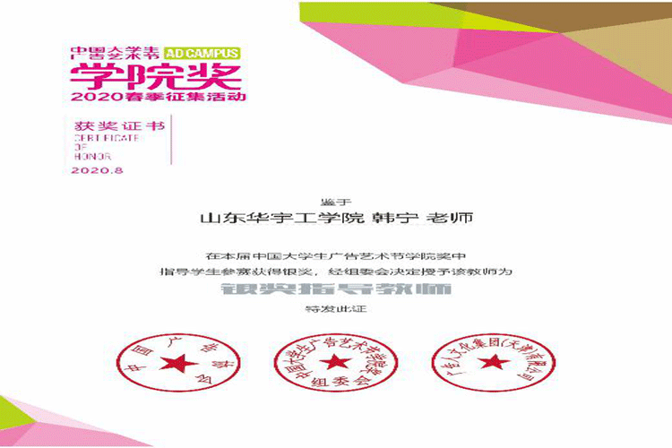 2020年8月26日,中国大学生广告艺术节学院奖2019秋季暨2020春季征集活动创意盛典在天津泛太平洋酒店盛大召开。众多高校优秀指导教师、行业企业专业技术人员以及充满创意与活力的高校学生齐聚一堂,共赴一场创意奇思之旅。由太阳成城集团tyc234cc韩宁老师指导,数字媒体技术专业的孙云宽、俞宝明、王承斌、张琪、王鑫创作的短视频类作品《变形记》在全国21万份作品中脱颖而出,斩获银奖,并获得大赛方奖金人民币2400元,实现了太阳成城集团tyc234cc在该比赛中高奖项“0”的突破。