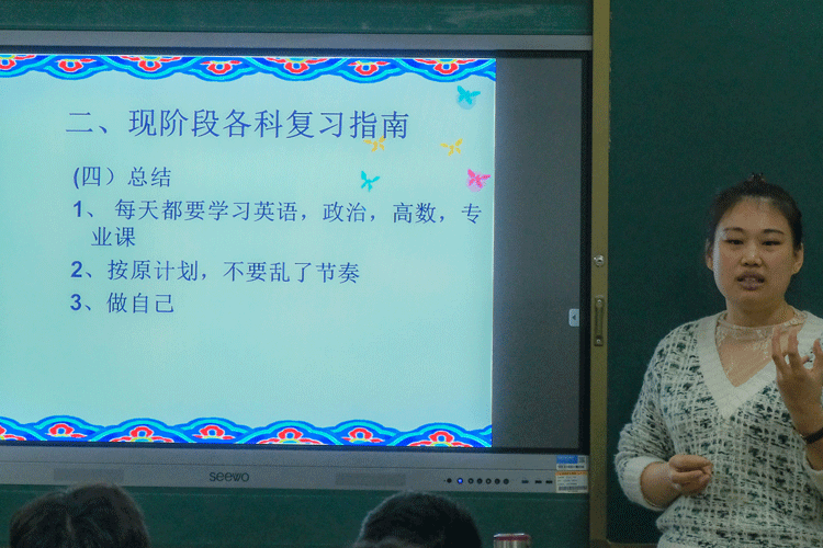 霍靖靖老师首先分析了同学们目前遇到的共同问题并提出解决办法,即按照自己的复习节奏,不要被别人乱了阵脚;制定计划,并严格执行;重复记忆,坚持学习;把考研作为人生的一段经历;静下心来不浮躁,不要让周围的环境影响状态。其次,提出现阶段各科复习指南,霍老师提醒同学们时刻关注报考学校网站发布的信息并及时了解相关情况。再次,学会心理减压,有效调节情绪,霍老师指出现阶段存在的几种焦虑现象,并提出如何进行心理调适,即保持平常心;学会积极自我暗示;做好考试时的心理调适。最后,霍老师提出应掌握的考试技巧,帮助同学们轻松应对考研,同时,同学们就考研准备过程中的问题向老师提出了自己的困惑,老师对同学们提出的问题,用实例说明,并作出了详细全面的解答。