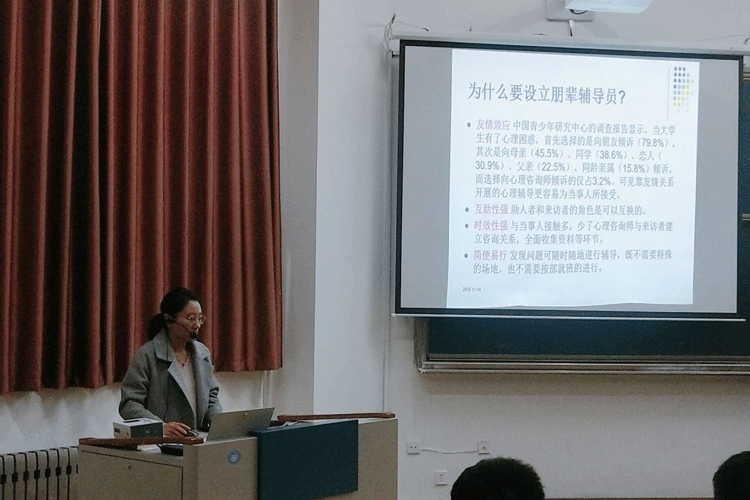 为进一步加强学院朋辈心理辅导员队伍建设,全面推进心理健康教育工作,2019年11月14日下午,太阳成城集团tyc234cc在6号楼104教室成功举办“朋辈心理辅导员培训”,主讲人为学院心理辅导老师张春红。参加此次培训的人员有2019级心理委员以及宿舍朋辈心理辅导员等200余人。