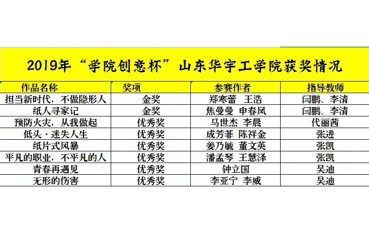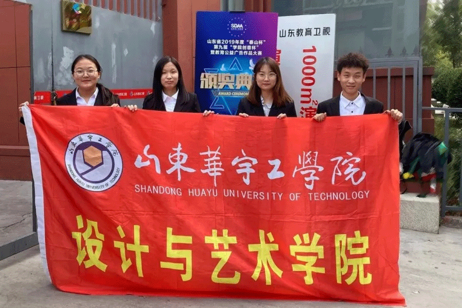 山东省2019年“学院创意杯”暨教育公益广告作品大赛由省教育厅、省市场监督管理局主办,山东大学承办,是广告艺术创作领域的一项权威赛事。山东大学、山东师范大学、山东工艺美院、山东建筑大学、山东美术学院、山东科技大学等众多知名高校参与角逐,我校学生表现突出,在7项金奖中独占2项,据悉,我校是所有参赛高校中唯一获得两项金奖的参赛单位。