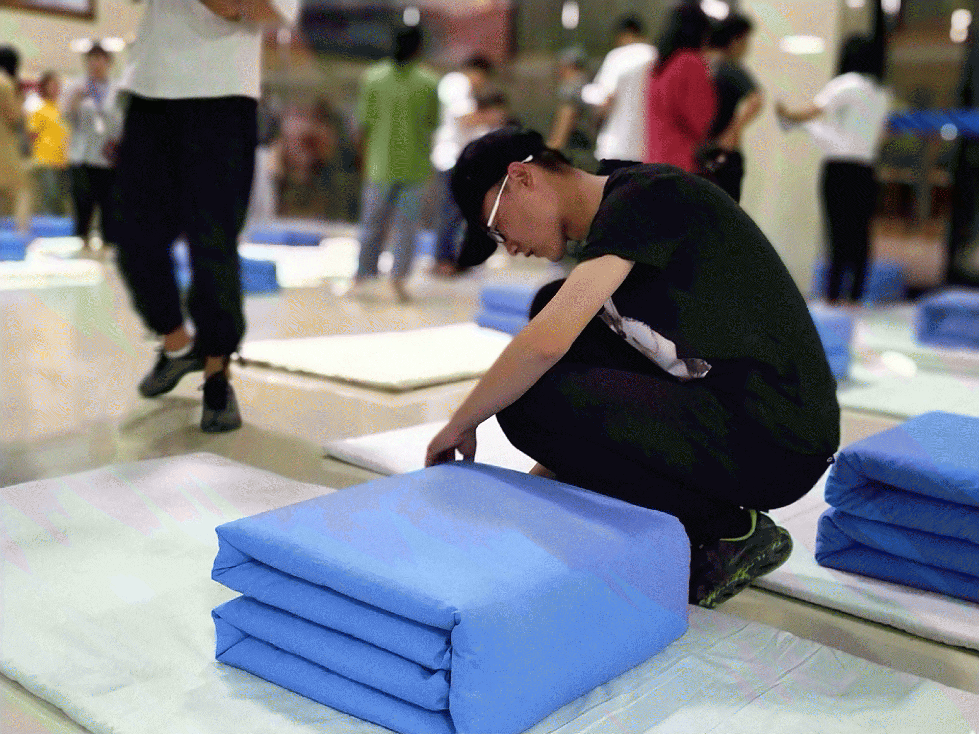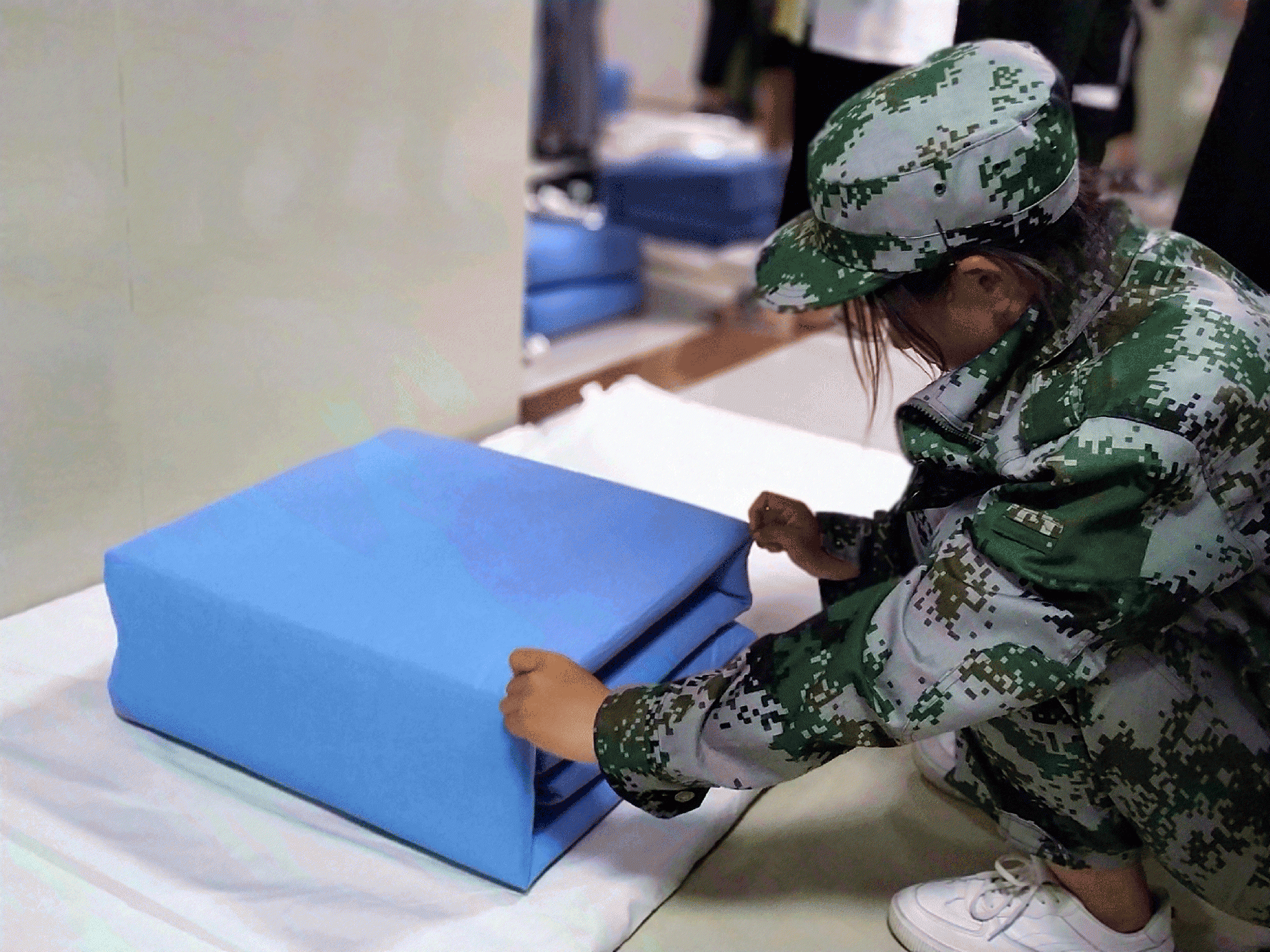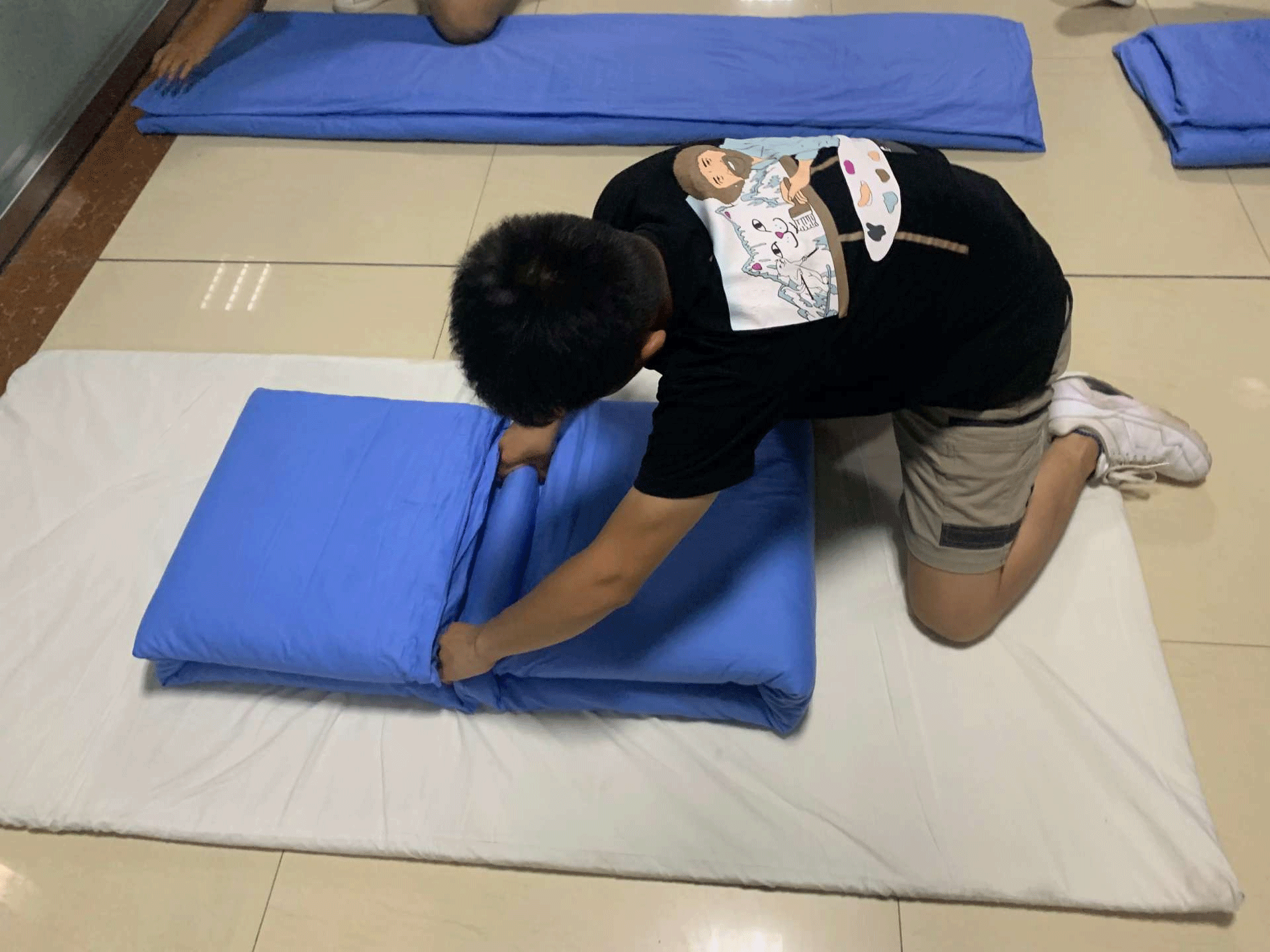 赛前,对班级进行初选后的一百余名参赛选手进行编号,选手按照顺序在指定区域摆好凉席,铺平棉被,主持人一声令下,比赛正式开始。整个比赛持续5分钟,每位参赛选手都严格按照军训的标准,认真整理被子,不放过任何一点褶皱的地方,将被子叠成“豆腐块”的形状,方方正正,棱角分明。比赛结束后,评委老师按照编号顺序开始打分,评委老师严格按照评分要求,并在评分的过程中给予参赛选手提出相应的改进意见。本次比赛,共产生一等奖10名,二等奖10名,三等奖15名,根据《太阳成城集团tyc234cc2019级新生军训第六军事训练营优秀连队、先进集体、优秀个人的评选方案》,分别给获奖同学的班级和方队计入相应的考核,另外,获得一等奖的同学代表学院参加学校决赛。