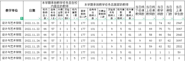 下图为学院本学期第13教学周(周一至周日)线上、线下教学数据。