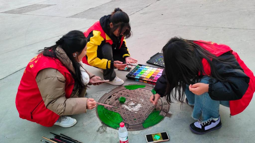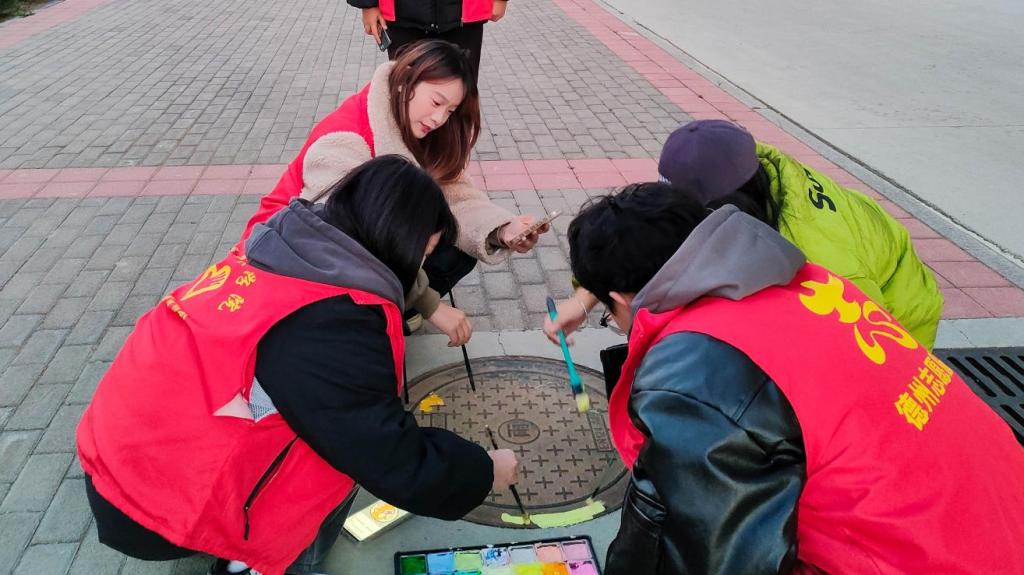 会议现场,由设计与艺术学院团总支书记霍靖靖介绍了项目化推进“百万大学生进社区”社会实践清单的具体情况,宣读了共建项目策划书,沟通了具体活动内容,提出了工作需求。副书记崔子剑表示欢迎同学们进入社区进行社会实践活动,社区将大力支持,全力配合共同达成美化社区的目的。会议结束后,同学们在社区内开展活动,为社区内的井盖添上了不同的色彩,为居民的生活环境带来了更加靓丽的色彩。