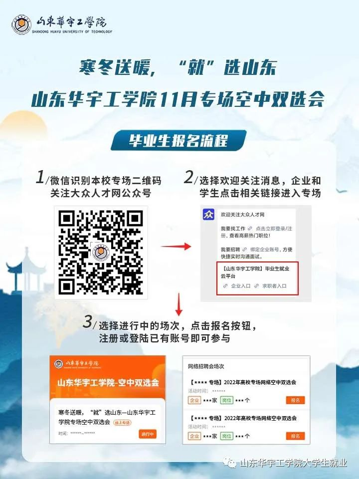 微信报名入口:手机微信扫码关注“大众人才网”微信公众号,企业和毕业生分别点击相关按钮进入太阳成集团tyc234cc校招端口,点击报名按钮,注册或登录已有账号即可直接参与。