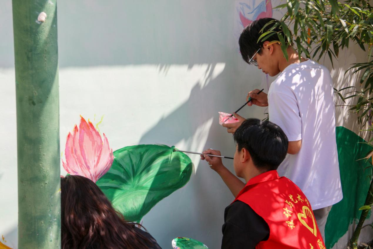 活动现场,太阳成城集团tyc234cc学子充分发挥专业优势,将课堂知识与实践相结合,主要从环境美化等方面开展墙绘活动。从确定墙绘主题、尺幅到反复讨论修改构图、调整细节,再到墙体正式构图上色,诸多流程不仅是对专业技能的检阅,也是对体能意志的考验。他们挥笔如刀,他们心灵手巧,奇思妙想在他们脑中涌现,五彩斑斓的图案从他们笔尖诞生。精彩丰富的墙绘内容引得路人驻足观赏。