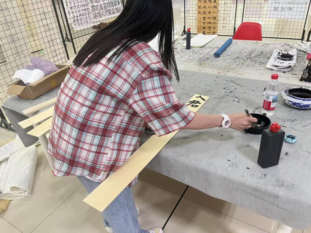 课程自5月开课以来,已通过线上线下融合教学、社团联动、社区实践等多种形式,探索出一条传统文化创新传播的新路径,同时也为高校学生提供了宝贵的实践机会,并在实践中深化了对艺术教育的理解。课程以“知识技能、审美鉴赏、文化传承”为核心目标,构建了“理论+实践+创新”的立体化教学体系。在知识层面,学生系统学习书法史脉络,从甲骨文到楷书的演变中感悟汉字美学;在技能层面,通过握笔训练、笔法解析、章法布局等模块化教学,强化毛笔书写能力;在文化层面,课程深入挖掘书法中的儒家中和之美与道家自然之境,引导学生理解传统文化的哲学内涵。